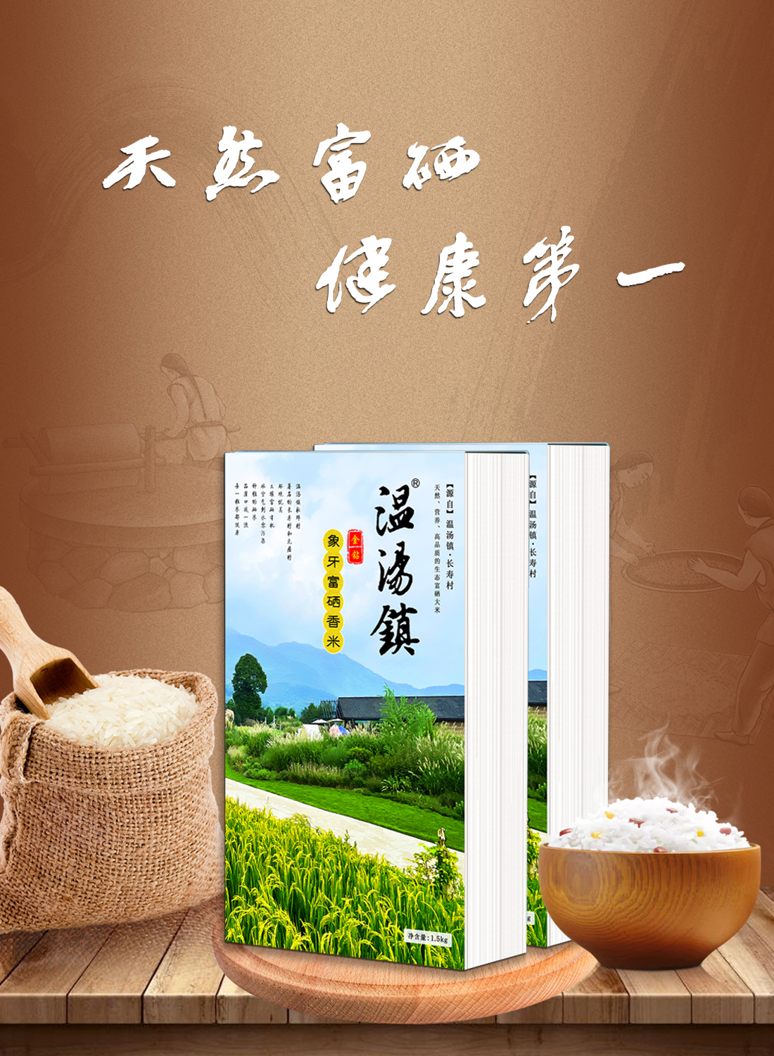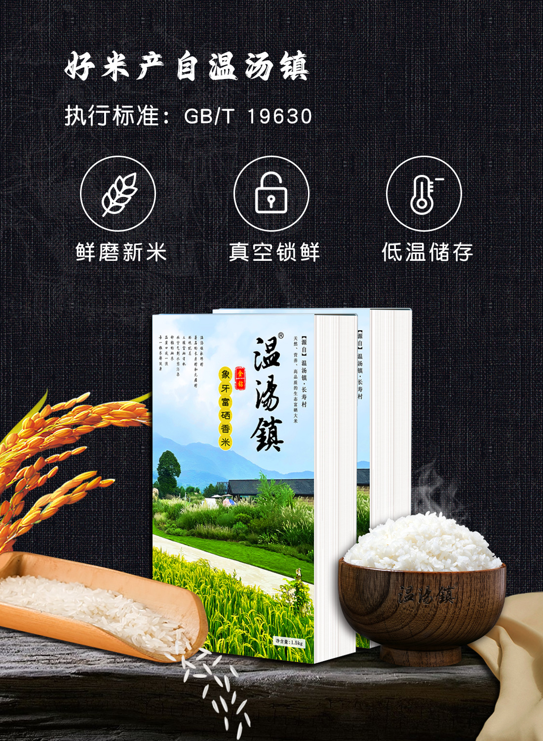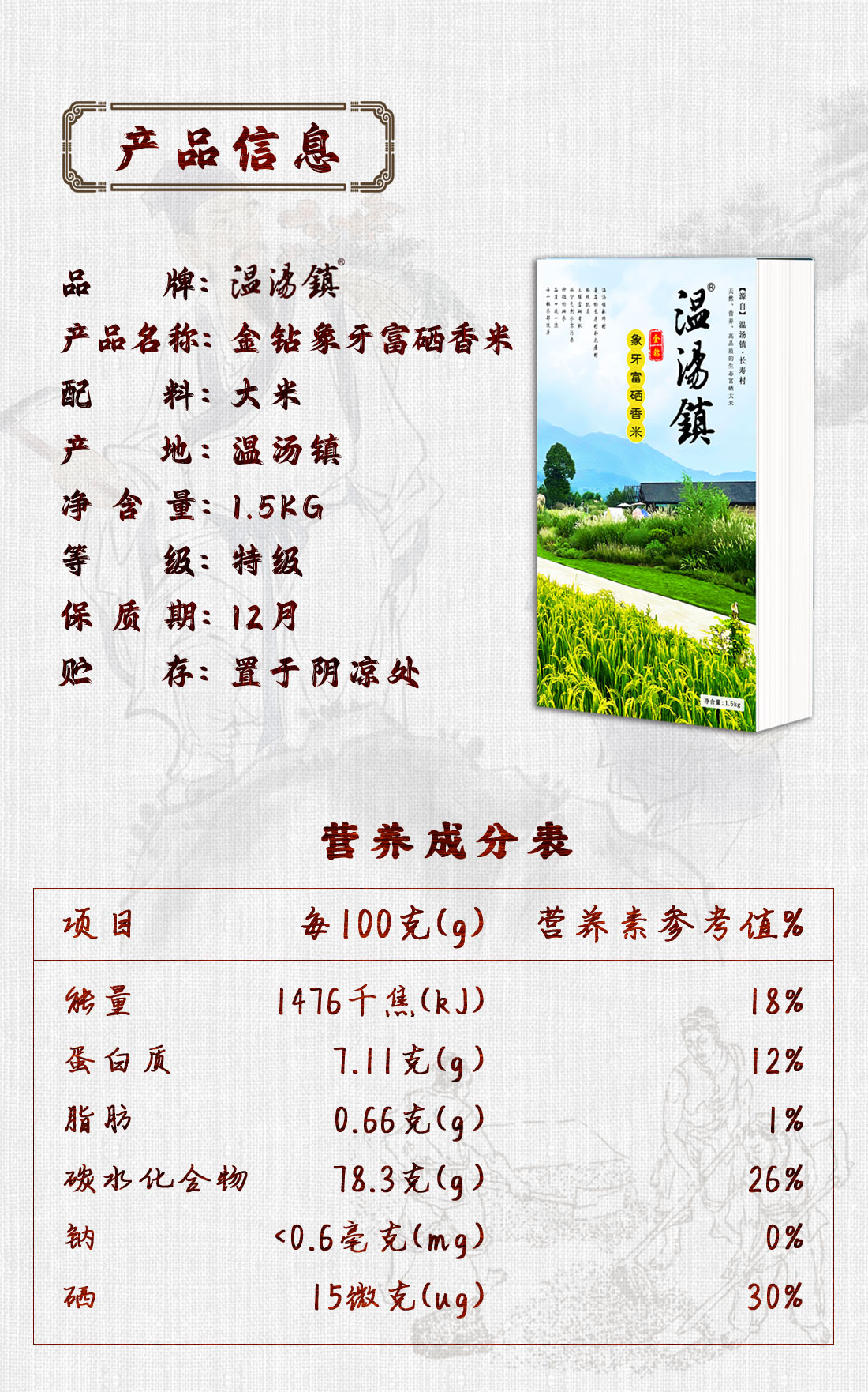 温汤镇-金钻象牙富硒香米优选品种,米粒品相细长、晶莹透亮,自然芳香、风味宜人,成饭香气浓郁、口感细软、入口顺滑,素有“米中碧玉 饭中佳品”美誉。产自宜春富硒优良产区,从土壤的富硒度、水源的澄澈度、地势的高低起伏,历经重重筛选严格把关,山环水绕、日照充足,自然耕作、山泉灌溉,稻鸭共生、有机种植,不追求单一产量,而注重大米品质。采用全球领先的制米工艺技术,米粒完整度高,最大限度保留脂肪、纤维素、矿物质和维生素等营养成分,是中国丝苗米的“品质典范”。